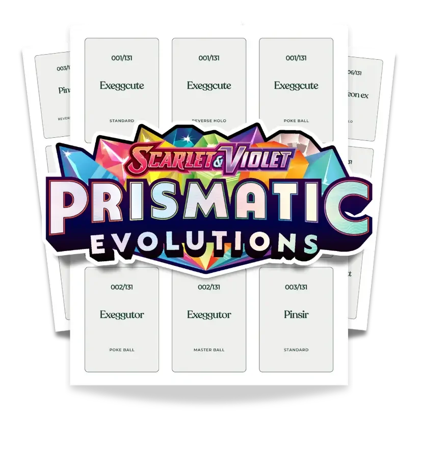Complete Prismatic Evolutions Master Set guide with official card count, rarity breakdown, binder recommendations, printable checklist, and binder layout mockup, to help you organize all 447 cards in this special master set.