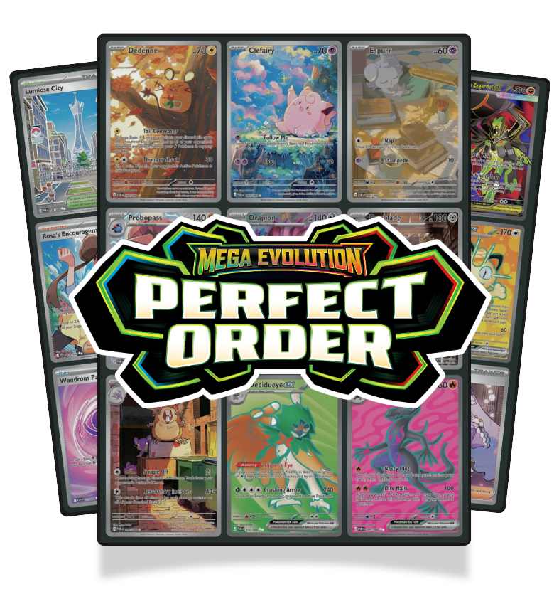 Perfect Order is the newest set in the English Pokémon TCG, featuring the debut of many new Mega Evolutions – Mega Zygarde, Mega Clefable and– love him or hate him– Mega Starmie. Explore our complete ME03 visual card list, organized by rarity for easy browsing and reference.